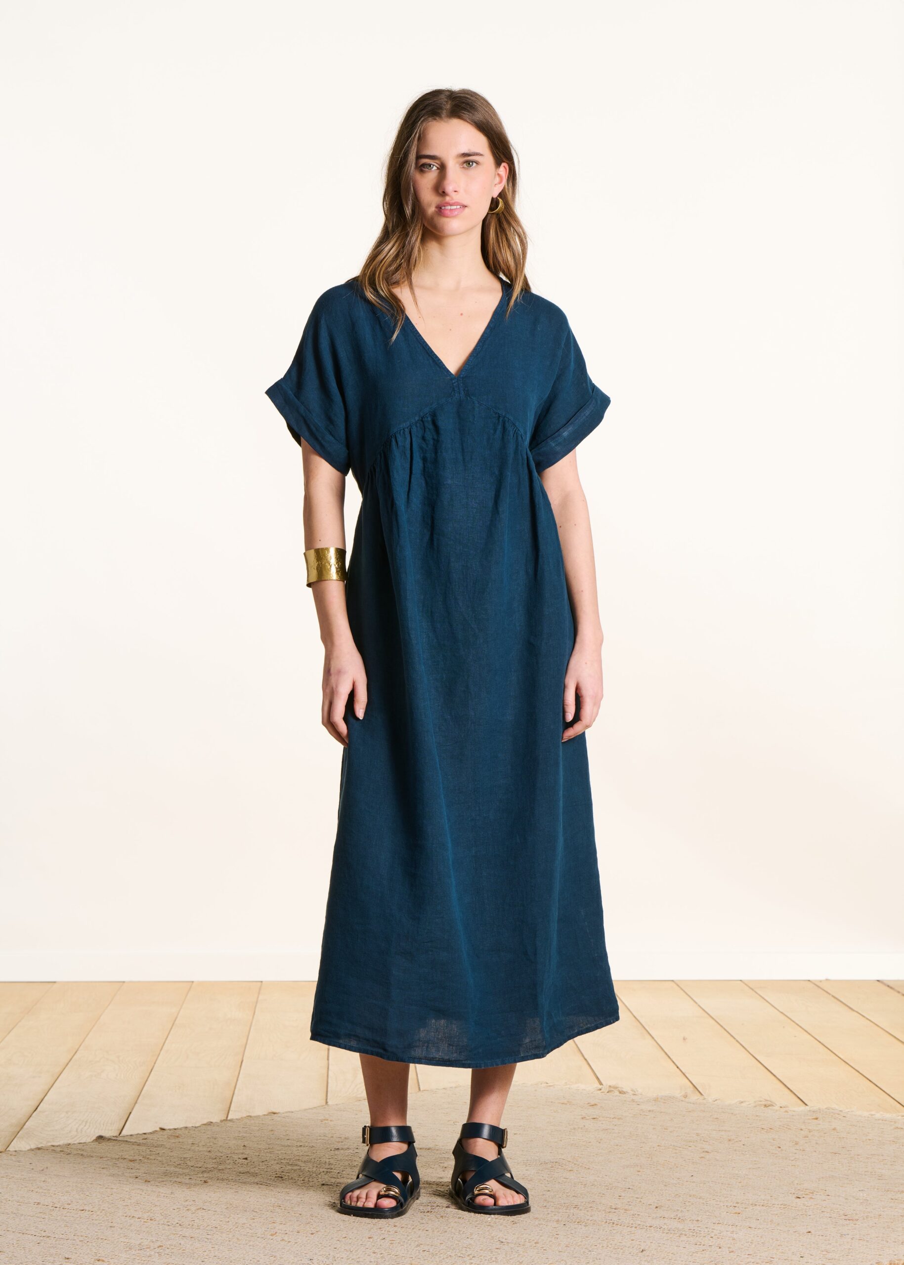 La Fee Maraboutee — Robe longue ample en lin bleu pétrole manches courtes